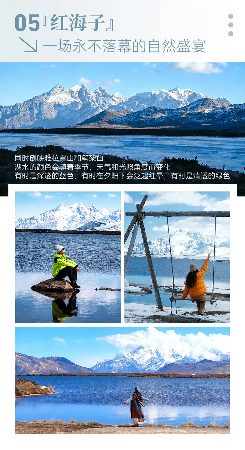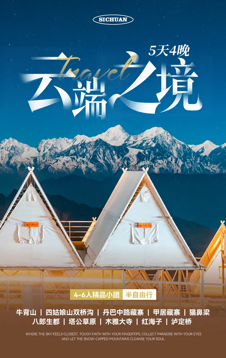 早餐后从塔公出发,游玩塔公草原和木雅大寺,我们将从刻经房,请出还未上色的石刻经版。用代表天空、大地、雪山、草原、太阳与菩提心的六种色彩,填描六字真言梵语字母,一边填描上色,一边心里默诵真言,然后放进规模宏大的玛尼石城,接受所有转经人的祈祷。这是对自己的祝祷,也是对所有亲人朋友的祝祷!之后我们选择走海拔最高的机场公路—康定机场旁边的S434省道,这是一个极易出片的网红点,一路是牛羊点点的江巴牧场,可遥望贡嘎雪山、回头可见雅拉雪山。沿途游玩红海子,下午抵达牛背山景区,这里换乘中转车后直达山顶,整理好行李之后,大家可以前往3666观景台,360°无死角的观景平台之中,每一眼都是云海之上的奇迹,彼岸的贡嘎群山宣示着蜀山亘古的壮美。
