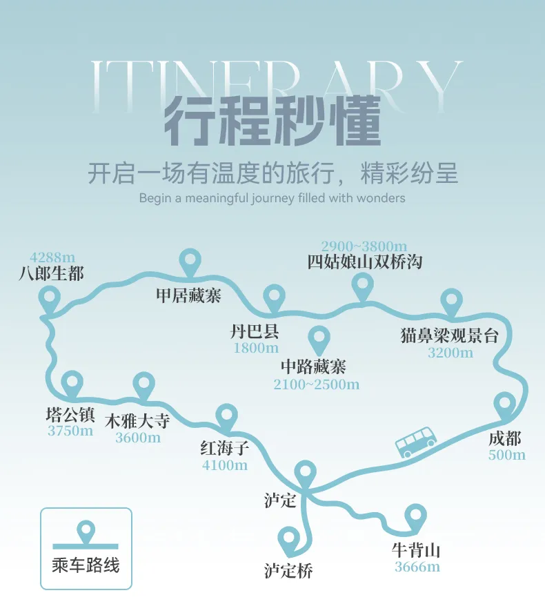 ▷ 海拔变化:成都500米 → 猫鼻梁3200米 → 双桥沟2900~3800米 → 丹巴1800米