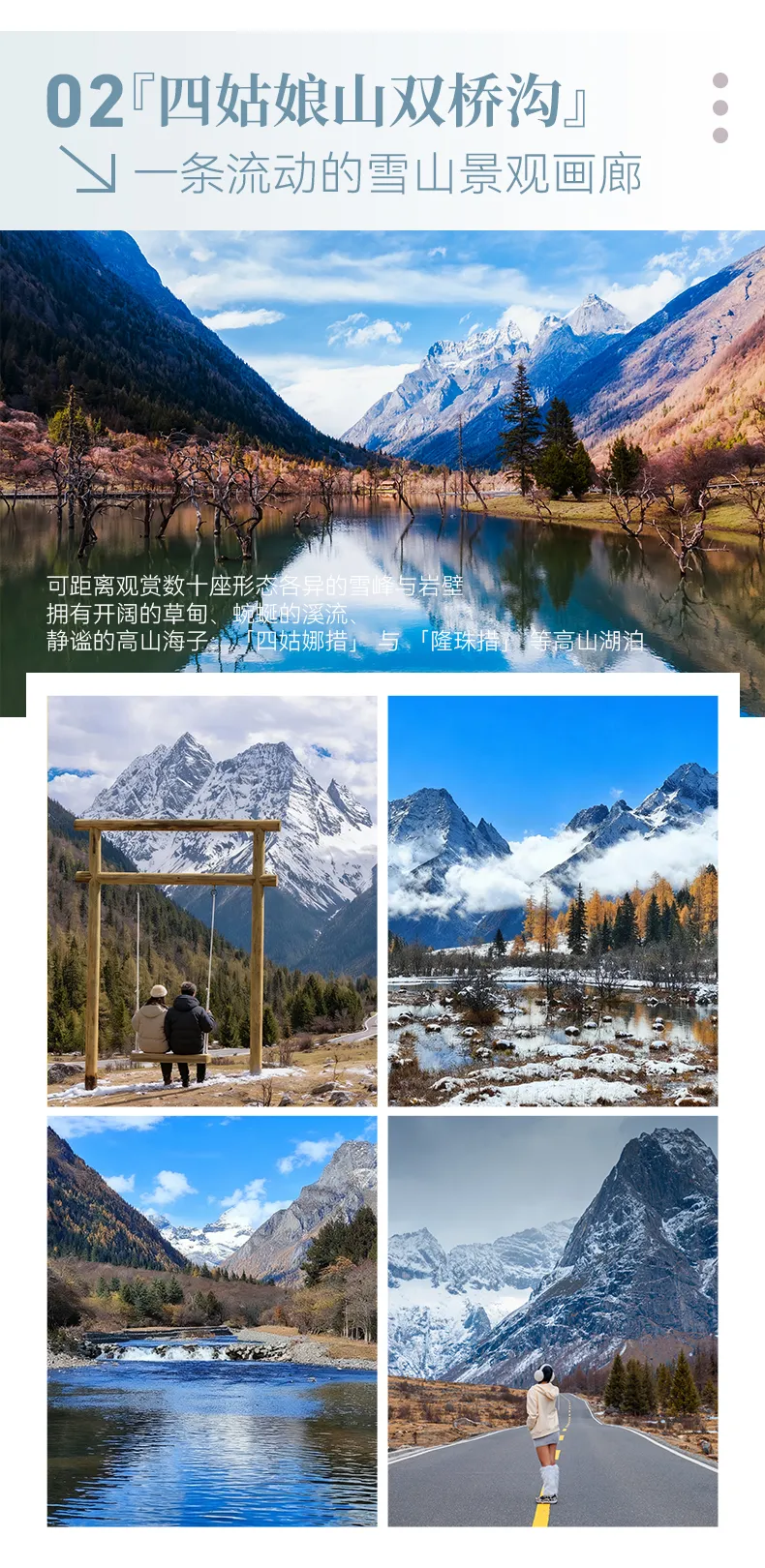 午餐后,我们深入【四姑娘山双桥沟】,轻轻松松便可领略沟内雪山巍峨、溪流清冽,在人参果坪、隆珠措、布达拉峰、红杉林等几个精华站点停留游览,游览结束后我们将启程抵达丹巴县中路藏寨入住。