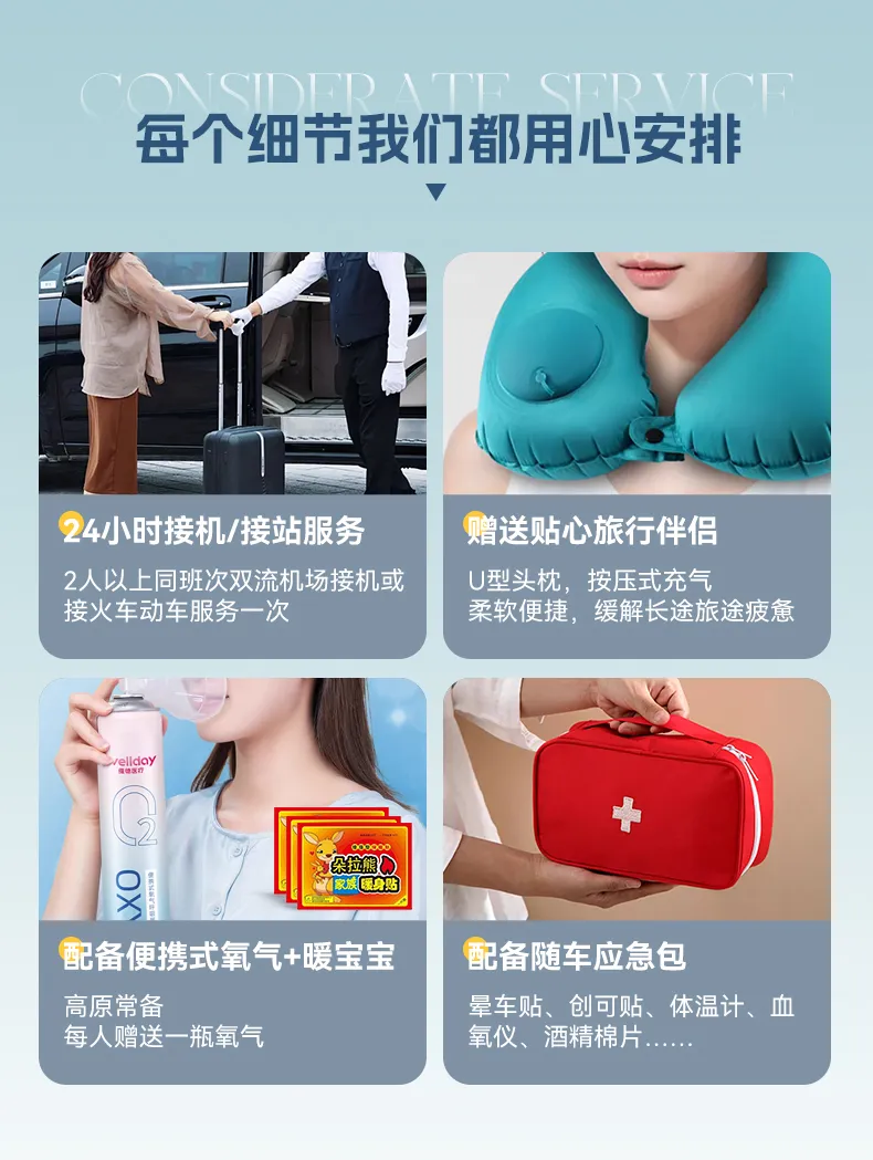 (1)赠送免费接送服务:2人及以上(同一班次)赠送成都市区24小时双流机场接机/市区接火车/动车服务一次;