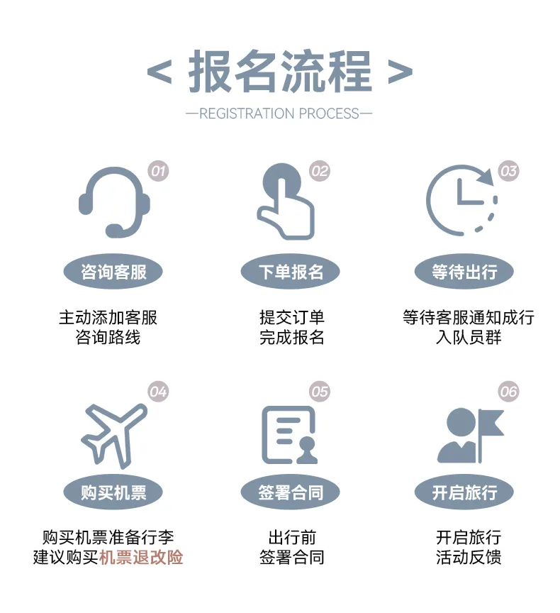 集合日当天请保持手机通畅(一般会在集合日下午/傍晚电话联系大家)。如21:00还未接到通知,请及时联系自己的报名客服确认。集合日无行程,请自行安排。