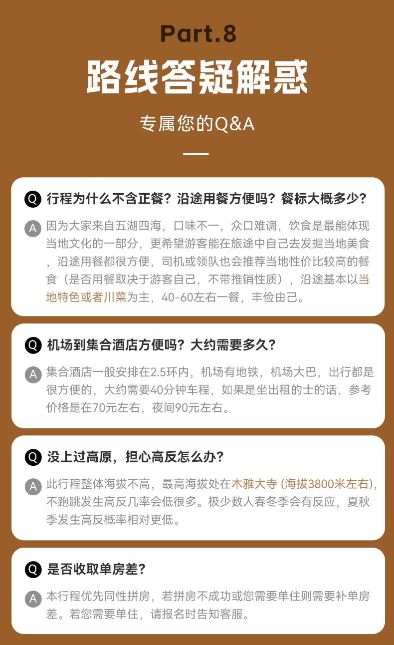 3、由于返回路程较长,可能会因为修路、交通管制,堵车耽误时间,到达时间较晚,川西地区路况较差,山道狭窄,有可能因为堵车而发生延误。请大家尽量预定第二天返程的航班或车次比较保险。