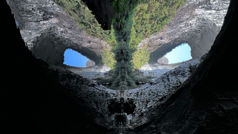 下午走出溶洞继续翻越天坑谷地、乱石坡、灌木林前往第二处地下河、看大圣之眼、凹造型拍美照、看穿洞,随后出山沿乡道返回起点,乘车前往安顺市区入住酒店,结束当天的徒步行程。
