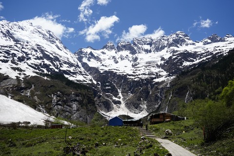 清晨用完早餐后, 从雨崩村出发,经高海拔原始森林及杜鹃丛林,徒步将近2小时后翻过海拔3900米的上那宗拉垭口,直至雨崩河底随后穿过一片原始松树林,约1小时后抵达海拔3600米的中日联合登山队“笑农大本营”。1991年由中日联合登山队修建而成,是登梅里雪山卡格博峰的一个大本营,去雨崩村旅游必去的一个地方,风景优美。