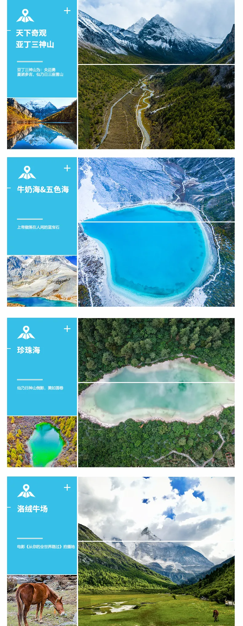 亚丁景区分为长短线,长线为牛奶湖和五色海线,短线为珍珠海线,高原徒步请根据自身体能选择游览线路,当天徒步请提前自行准备好中午路餐,高原徒步考验体力,请根据自身体能情况而定,不可逞强,避免给自己造成不必要的麻烦,敬请知悉。