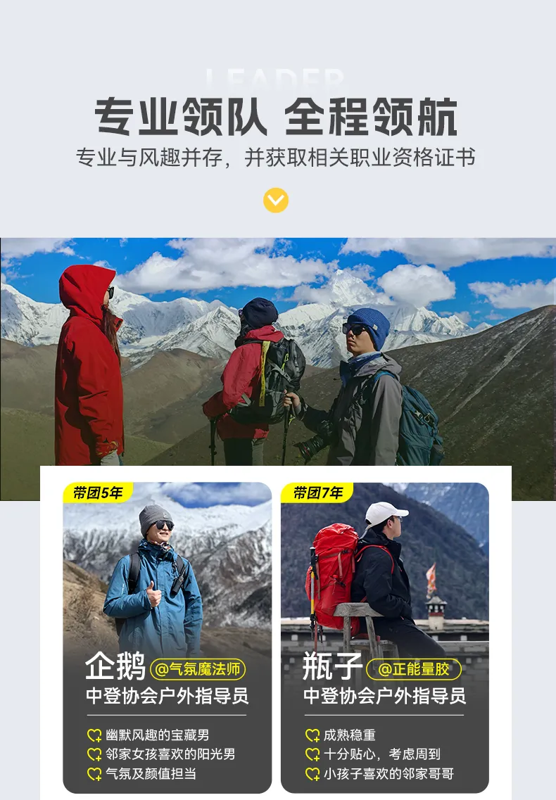 8.我们所设计的产品多为户外徒步、摄影、登山探险路线,操作流程比较繁琐也具备一些突发的风险性,天气、自然灾害、地方政策等客观因素常常会影响原定计划的实施。应对突发情况时,如大雪封山道路受阻等情况为避免不确定风险领队有权给出行程变更方案,与全体队员协商并投票,表决通过,不能因个人冒险行为影响领队的工作和判断。