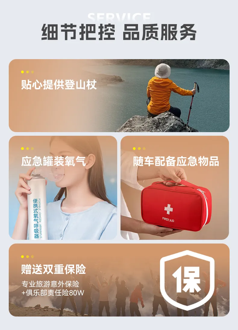 特别声明:工作人员因没有医疗资质,随车只提供瓶装氧气,提供常规感冒药品等,无其他特殊药品,请提前备足适合自己的药品。