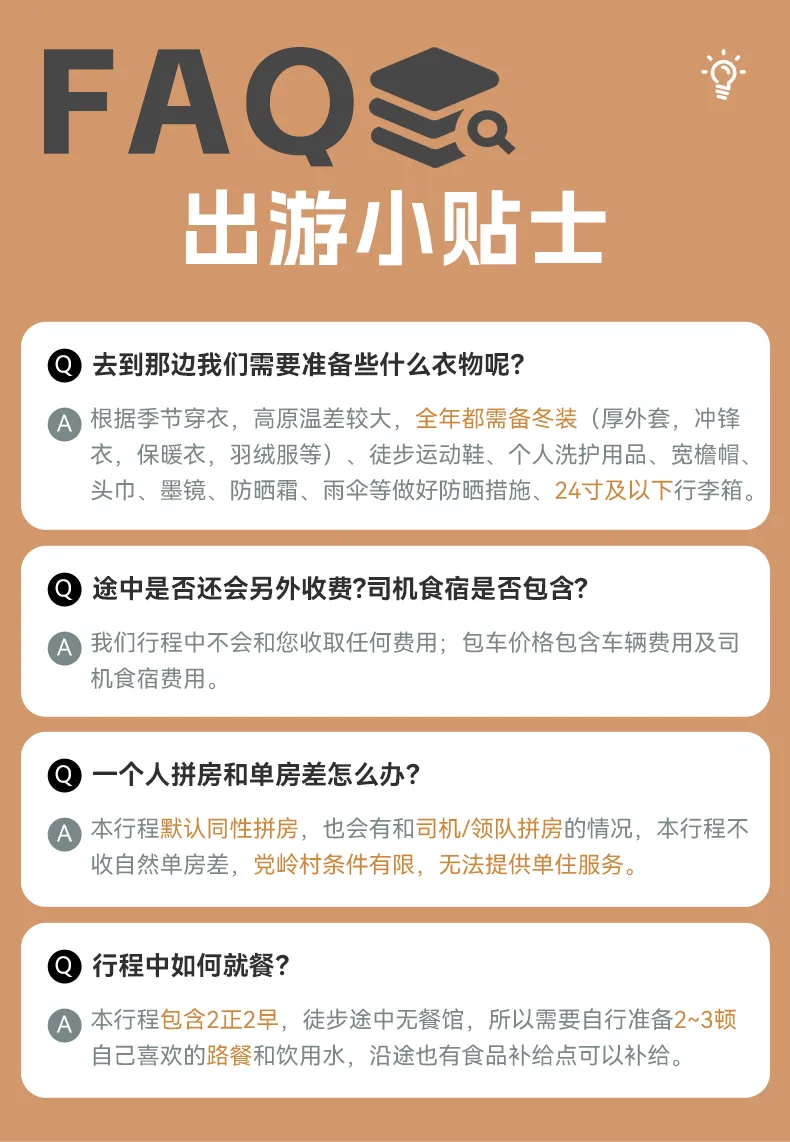 1.高原徒步活动不同于常规旅游团,重在全身心的体验,对参加队员的安全、体力、环保及团队协作精神要求较高;在活动过程中建议队员和队员之间互帮互助建立良好的友谊,队员和领队之间也建立好组织者和参与者的关系,领队做好本职服务和领队职责,队员需要在行程中尊重领队的意见和正确的决策,除此之外希望可以超越契约关系可以朋友相处,会让整个行程更加轻松愉快。