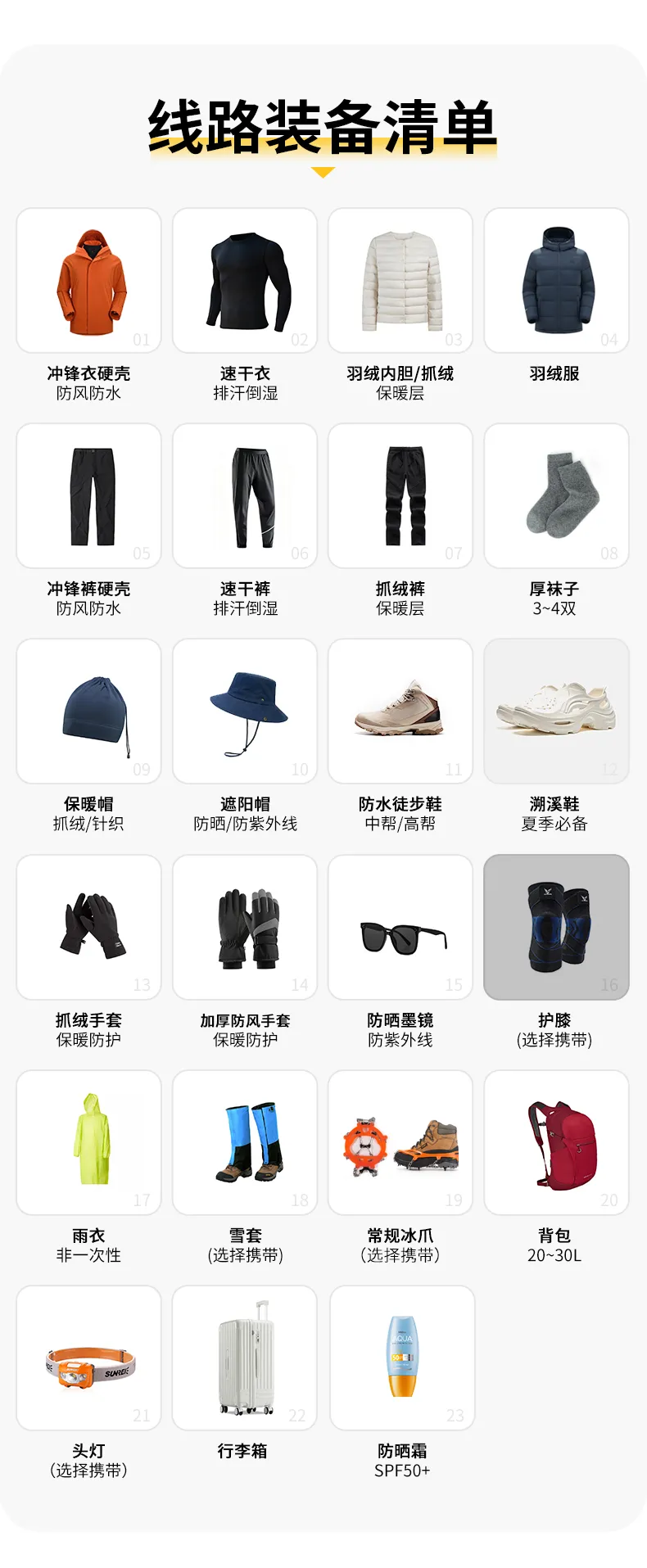 18.高原地区热量流失迅速,因要进行长途跋涉,请自备高热量食品以补充体力,巧克力、维生素、电解质冲剂等可适当准备。